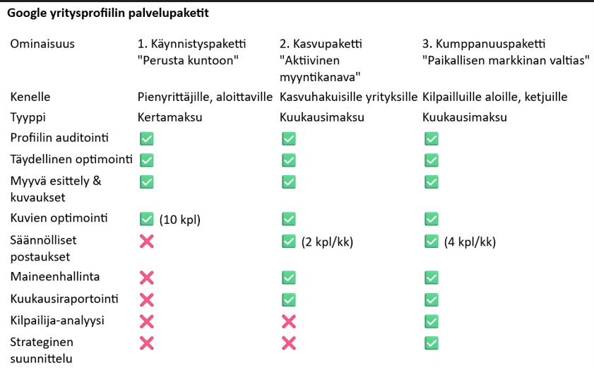 Mitä jos yrityksesi Google-profiili ei olisi vain digitaalinen käyntikortti, vaan jatkuva virta uusia asiakkaita ja myyntiliidejä? Meidän Googlen Myyntityökalumme mullistaa tapasi näkyä ja tehdä kauppaa, toimialasta riippumatta.